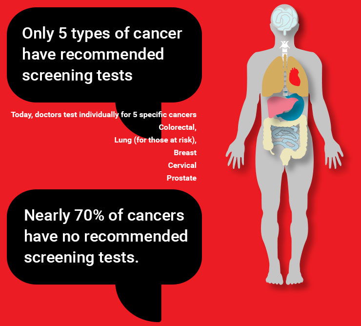 Our testing screens for a unique “fingerprint” of many of the deadliest cancers, including those with no recommended screening tests today. The test looks for DNA in the blood sample shed by cancer cells.